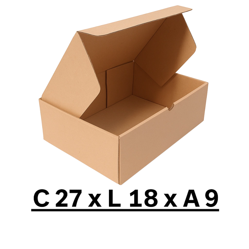 A Caixa de Papelão Kraft Auto-Montável 27 x 18 x 9 cm é resistente, prática e ideal para envios pelos Correios, transportadoras e e-commerce.